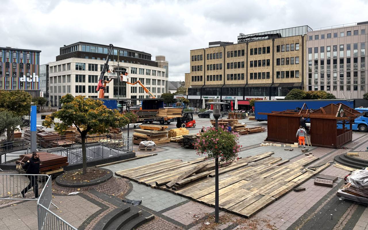 In Essen wird auf dem Kennedyplatz bereits gesägt und gehämmert – der Countdown für den Weihnachtsmarkt läuft. Schon jetzt wird die größte Hütte des Marktes aufgebaut.
