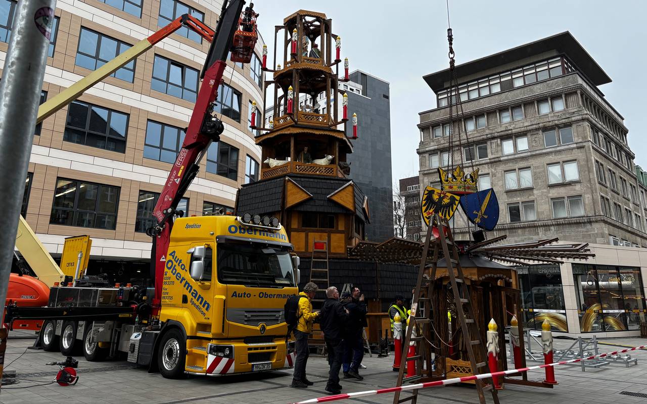 Der Aufbau des Internationalen Weihnachtsmarkts in Essen hat begonnen. Highlight wird eine 20 Meter hohe Weihnachtspyramide. Eröffnung ist am 15. November.