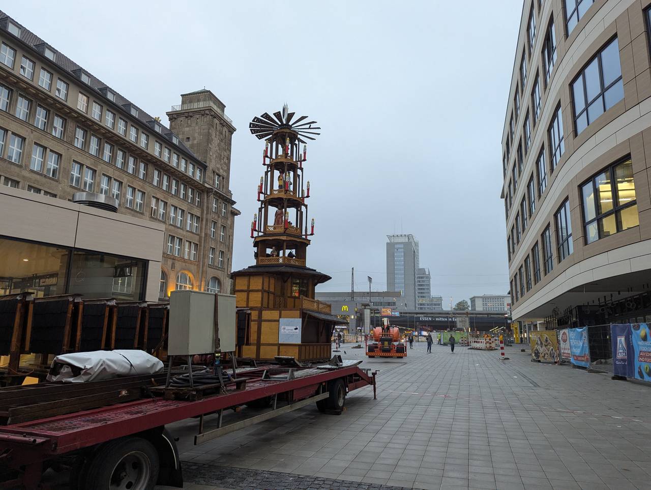 In der Innenstadt von Essen hat der Aufbau des Internationalen Weihnachtsmarkts begonnen. Insgesamt werden 170 Hütten von Händlern aus rund 20 Ländern errichtet. Auf dem Willy-Brandt-Platz wird in diesem Jahr eine rund 20 Meter hohe Weihnachtspyramide aufgebaut, die zu den größten der Welt gehört. Nach vier Jahren Bauzeit am Königshof ist der Willy-Brandt-Platz in diesem Jahr wieder Teil des Marktes. Der Weihnachtsmarkt wird am 15. November eröffnet und läuft bis zum 23. Dezember.