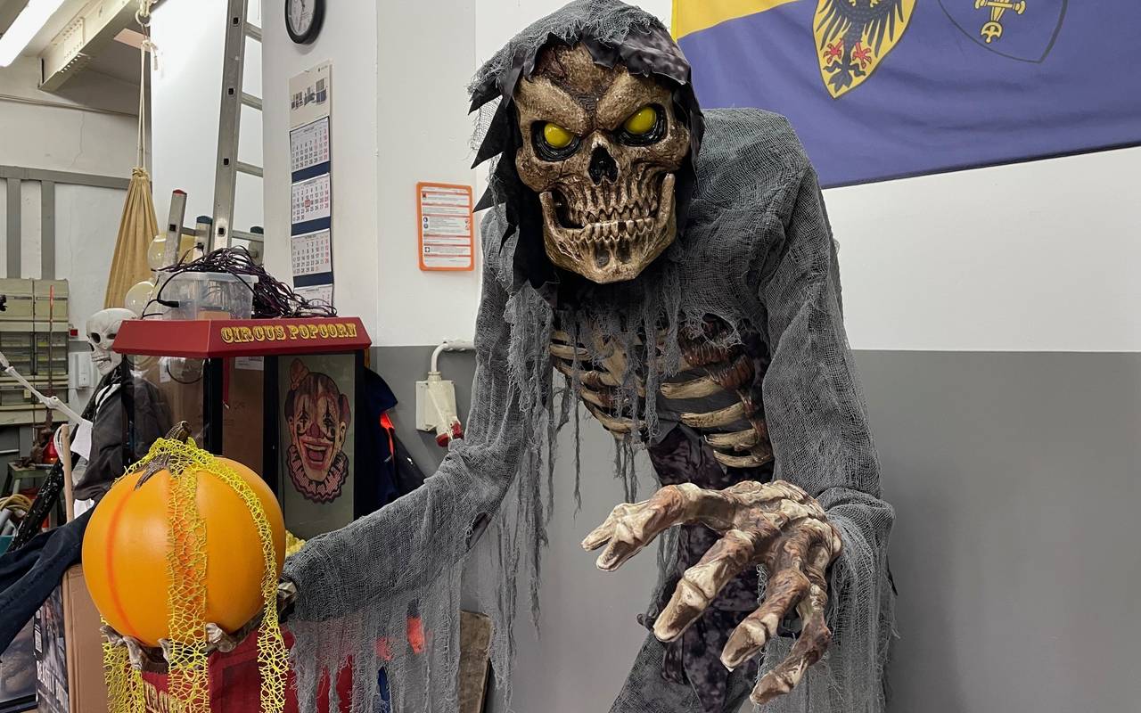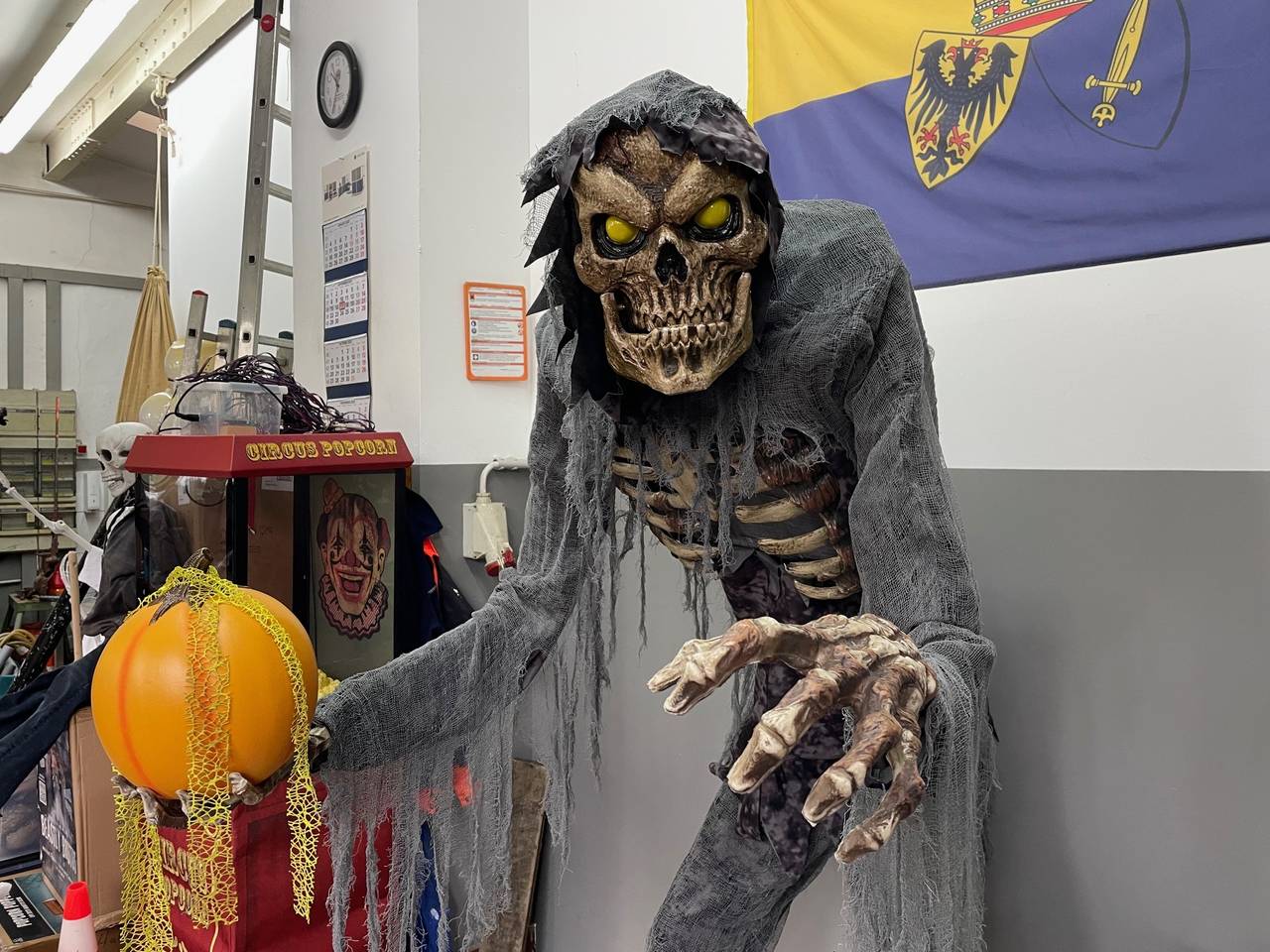 "Jack, the storker" ist ein zwei Meter großes bewegliches Knochengerüst mit einem sprechenden Kürbis in der Hand. Auch die Popcornmaschine daneben jagt unserem Reporter einen ordentlichen Schrecken ein. Statt Süßem gibt es einen Gruselclown, der aus dem Popcorn springt. Mehr Spaß machen da die Skelettos Boris und Bruce. Die beiden Knochengerüste greifen zur Gitarre und zum Mikro und geben während unseres Interviews schon mal ein kleines Ständchen. In den nächsten Tagen verlassen sie zusammen mit vielen weiteren Dekorationen die Werkstatt und machen die Mole des Hafens der Weissen Flotte unsicher.
