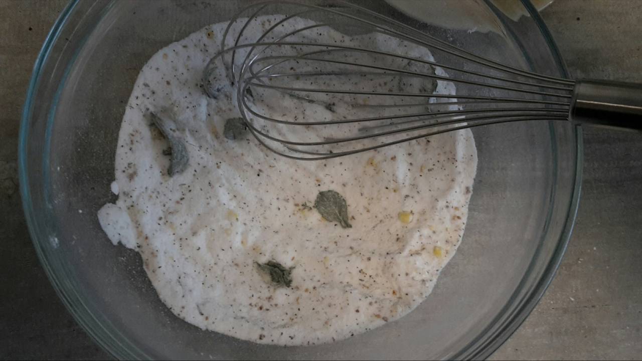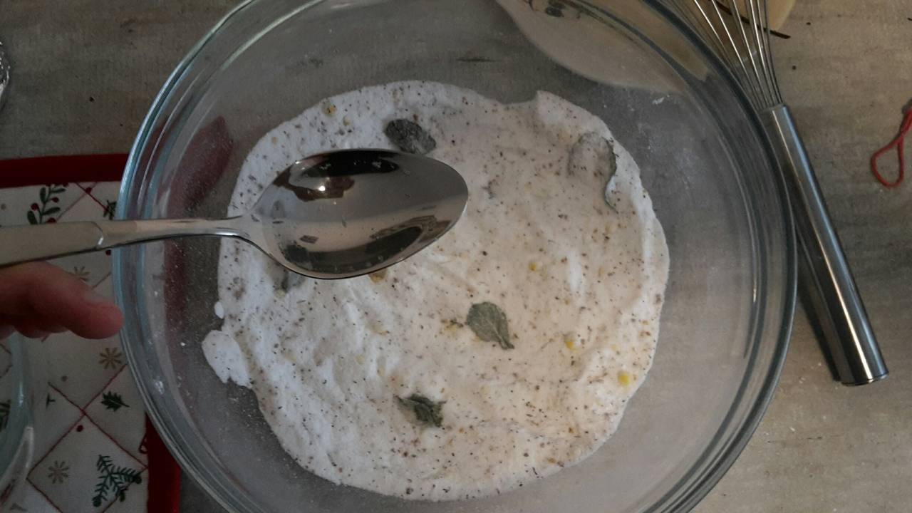 - Schritt 2: Dann die getrockneten Kräuter sowie ca. einen halben Teelöffel Zitronenschale geraspelt hinzugeben und wieder gut verrühren.