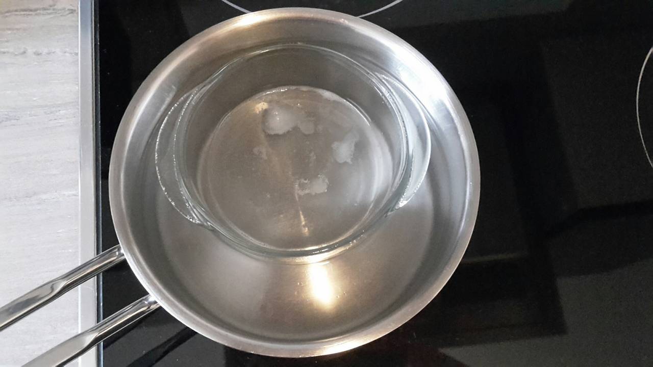 - Schritt 3: Das Kokosöl in einem Wasserbad auf leichter Hitze erwärmen, sodass es schmilzt. Es sollte dabei aber wirklich nicht mit Wasser in Berührung kommen, das kann sonst in den weiteren Schritten Probleme geben.