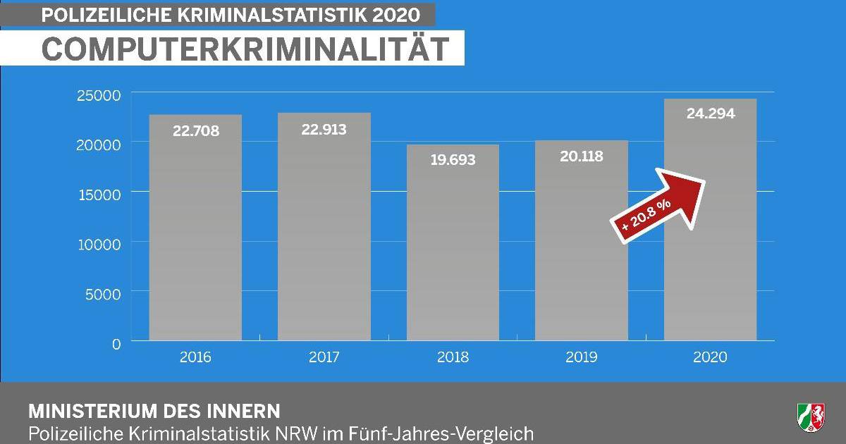 Einen echten Anstieg gibt es in der Cyberkriminalität - um fast 21 Prozent. Innenminister Reul sagt, dass die Zahl der Fakeshops im Netz massiv gestiegen sei.