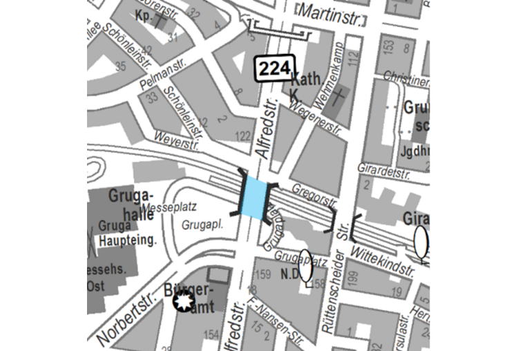 Durch die Konstruktionsdicke der Wände und Decken reduzieren sich die Breiten um etwa 1,50 bis 2 Meter und die Decken haben zukünftig eine rund 0,80 bis 1 Meter tiefe Unterkante. Damit auch mobilitätseingeschränkte Menschen die Alfredstraße überqueren können, soll möglichst vor dem Rückbau der Rampen in Höhe der Gregorstraße eine Ampel eingerichtet werden. Sowohl westlich als auch östlich neben dem Bauwerk sind Treppenanlagen für Fußgänger geplant. Dadurch sollen die Menschen auch schneller auf den Grugaweg kommen. Im Westen soll außerdem das Schönleinviertel durch eine barrierefreie Rampe vom Grugaweg aus erschlossen werden. Die künftige Unterführung der Straße Grugaplatz soll neben der 6,50 Meter breiten Fahrbahn auf der Nordseite einen mindestens 2,50 Meter breiten Gehweg bekommen. So soll man von den Stellplätzen schneller zur Grugahalle, den Grugapark und die Messe kommen - ohne die Straße überqueren zu müssen.