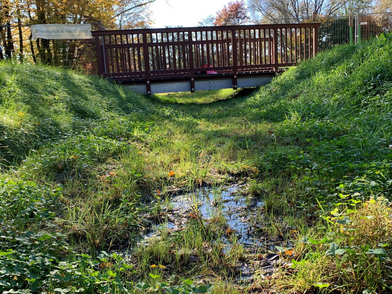 Mit Gummistiefeln durchs Wasser laufen: Für Kinder ein Traum! Das geht bald in Katernberg. Der Bach dort kommt an die Sonne. Bisher lief er durch ein unterirdisches Rohr, zusammen mit dem Schmutzwasser. Jetzt hat ihn die Emschergenossenschaft ans Tageslicht geholt. Am Bach gibt es ab sofort eine Holzbrücke mit großen Steinen in der Mitte (s. Foto), damit die Kinder von der einen Seite zur anderen balancieren können. Aktuell fehlt aber noch das Wasser.