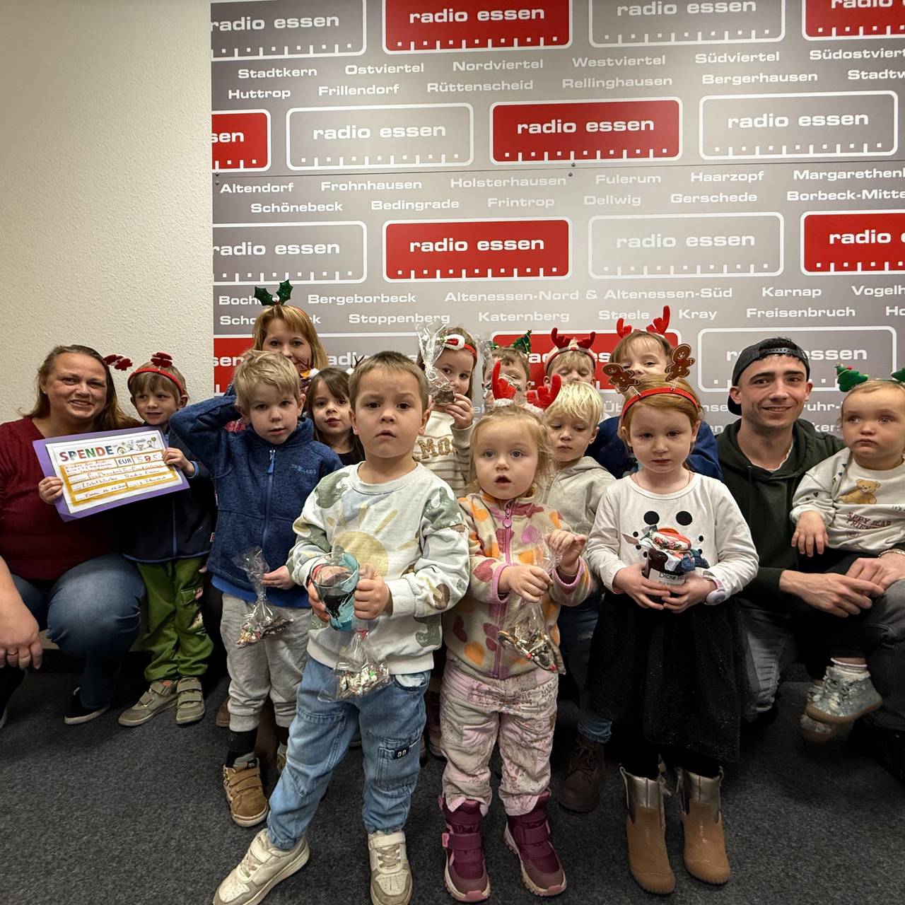 Die Kinder aus der AWO-Kita am Heidbusch in Schönebeck haben fleißig mitgeholfen. Zusammen mit ihren Erzieherinnen und Erziehern und ihren Eltern haben sie in der Vorweihnachtszeit gebacken, gebastelt, Marmelade gekocht und noch viel mehr gemacht. Beim Weihnachtsbasar in der Kita haben die Kinder alles verkauft und 585 Euro eingenommen. Den selbst gebastelten Scheck haben sie gemeinsam mit ihren Erzieherinnern, Erziehern und Eltern im Radio Essen-Studio vorbeigebracht und Radio Essen-Moderatorin Teresa Ledabyl übergeben. Sie hat sich riesig gefreut und zusammen mit den Kinder "In der Weihnachtsbäckerei" gesungen. Die Kinder können den Text perfekt.