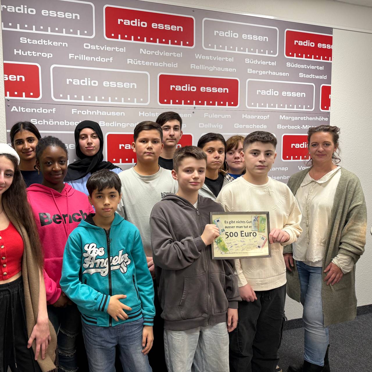 Die Schülerinnen und Schüler der Klassen 8e und 8f der Erich-Kästner-Gesamtschule in Steele haben tagelang kleine Teelichter gebastelt. Unter dem Wachs haben sie kleine Sprüche und Wörter gesteckt. Wenn das Wachs in den Teelichtern flüssig wird, dann taucht auch der schöne Spruch auf. "Mit viel Liebe" haben wir das gemacht, erzählt Lin im Interview mit Radio Essen-Moderator Joshua Windelschmidt. Achmed erzählt, warum die Schülerinnen und Schüler 500 Euro an die Aktion Lichtblicke spenden. Stolz überreichen sie die Spende in einem selbst gebastelten Bilderrahmen. Beim Besuch im Radio Essen-Sendestudio löchern sie anschließend den Moderator mit ihren Fragen und wollen genau wissen, wie das alles beim Radio funktioniert. Geduldig haben wir ihre Fragen beantwortet und freuen uns sehr über den Besuch.