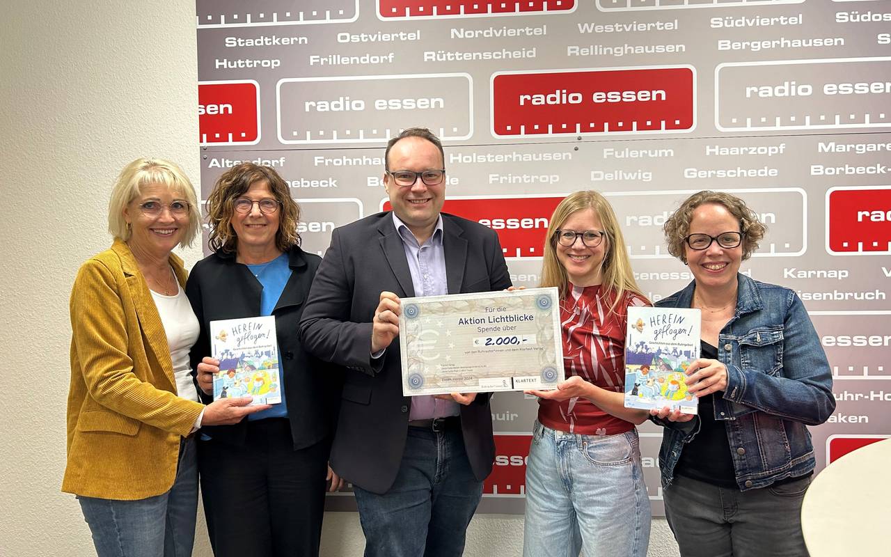 Im Klartext-Verlag ist jetzt das Kinderbuch "Hereingeflogen" erschienen. Die Ruhr-Autorinnen haben gemeinsam an dem Projekt gearbeitet. Sie haben Geschichten aus und über das Ruhrgebiet geschrieben. Ihre Kolleginnen und Kollegen haben die Geschichten und Gedichte illustriert. Entstanden sind Geschichten über Erdmännchen, die Musik lieben, Kinder, die im Park nach Noten suchen oder nach einer entlaufenen Katze. Das Buch ist für Kinder zwischen 6 und 10 Jahren. Die Ruhr-Autoren und Ruhr-Autorinnen spenden ihr Honorar in Höhe von 2000 Euro und erzählen Radio Essen Moderatorin Anna Bartl hier noch mehr über die Geschichten im Buch. Den Scheck hat Timo Naumann, Mitglied im Beirat der Aktion Lichtblicke in der Radio Essen-Redaktion entgegen genommen und den Autorinnen erklärt, wie im Beirat das Geld verteilt wird.