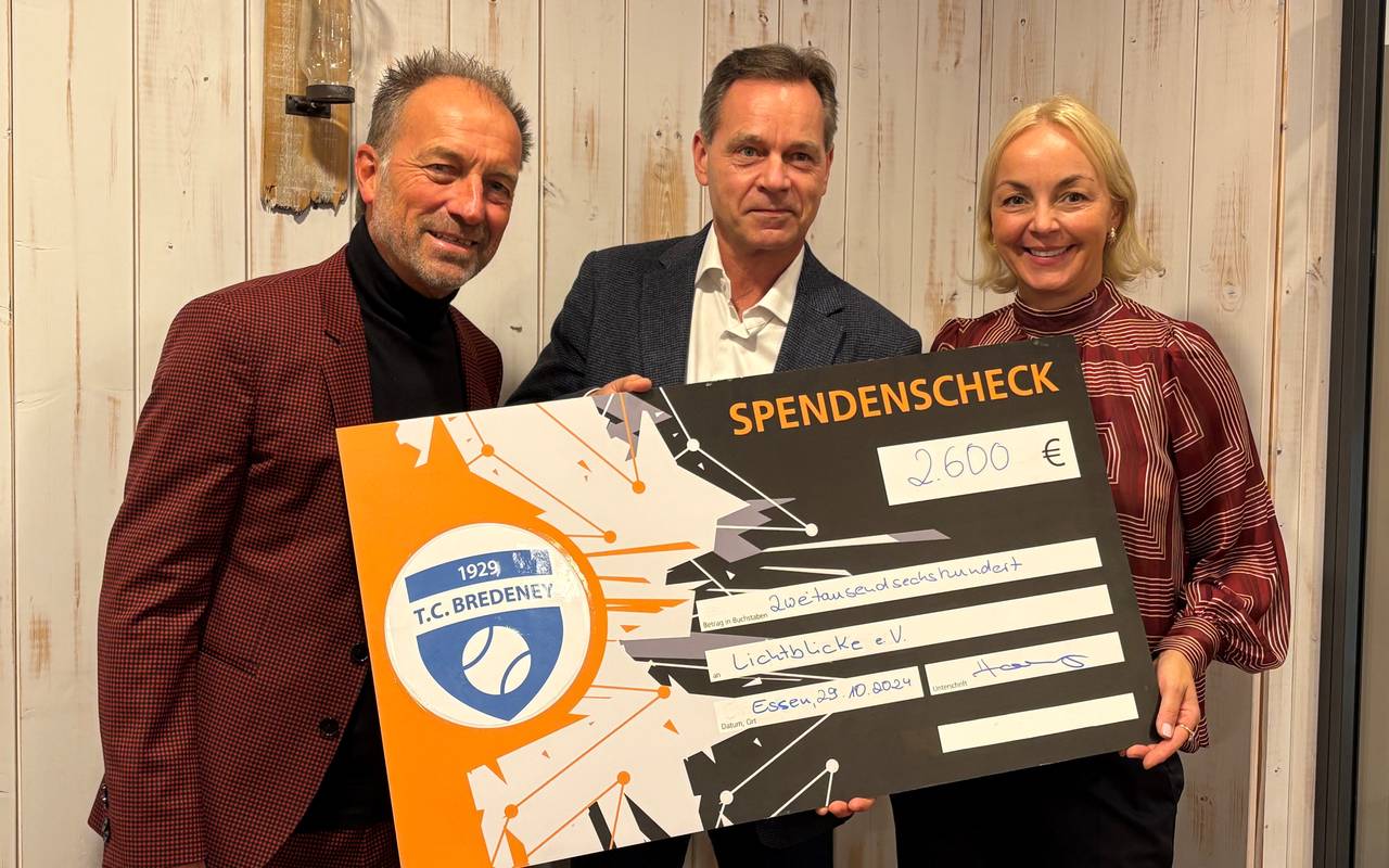 Beim TC Bredeney wurde am Sonntag (17. März) hart trainiert. Die Trainerinnen und Trainer der Tennisschule "Team Tennis GbR" beim TC Bredeney haben alle zum Training eingeladen. Die Trainerstunde haben sie gegen eine Spende für die Aktion Lichtblicke und den Förderturm Essen angeboten. Dabei standen nicht nur die Trainer auf dem Platz, auch die Spieler aus der ersten Bundesligamannschaft waren dabei. Wer wollte konnte also gegen die Profis spielen. Oscar Otte, Mats Morain, Julian Lenz, Philip Kohlschreiber und Tobias Kamke hatten immer wieder den Schläger in der Hand und jede Menge Tipps für ihre Gegner. Es war ja eine Trainingseinheit. Dazu wurde Kuchen verkauft und 1010 Euro gehen an Lichtblicke. Die gleiche Summe geht an den Förderturm in Essen und hilft so ebenfalls Kindern und Jugendlichen. Esther Rekasch von der Tennisschule war nach dem Tag geschafft, aber sehr glücklich, sagt sie Radio Essen-Moderatorin Anna Bartl bei der Scheckübergabe.