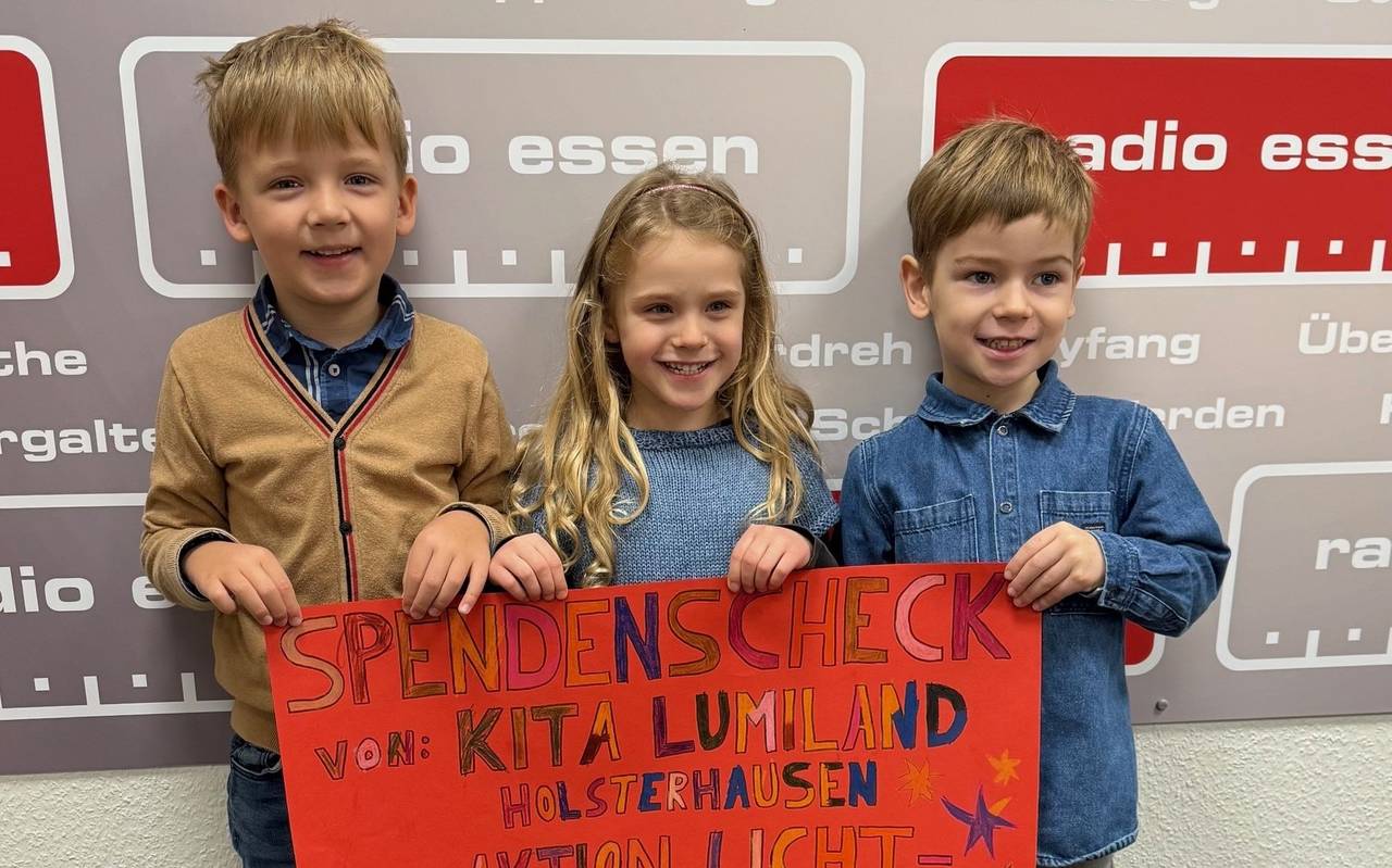 Jedes Jahr wird fleißig gebacken in der Kita Lumiland in Holsterhausen. Kinder, Eltern und Erzieherinnen legen sich mächtig ins Zeug und backen Plätzchen mit und ohne Streusel. Es gibt gebrannte Mandeln, selbst gekochte Marmelade und noch mehr Leckereien. Dann ziehen die Kinder los in die Unternehmen, in denen die Eltern und viele andere arbeiten. Das ist bei E.on und Westenergie am Brüsseler Platz in Rüttenscheid. Die liebevoll gepackten Plätzchentüten finden dort auch gern ihre Abnehmerinnen und Abnehmer. 1055 Euro haben die Kinder in diesem Jahr eingenommen und bringen die Spende mit ihrem selbst gebastelten Scheck ins Radio Essen-Studio zu Moderatorin Antonia Weiß.