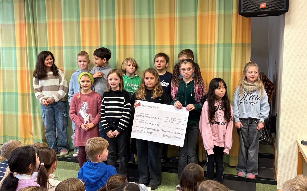 Mit viel Elan sind die Schülerinnen und Schüler an der Grundschule Überruhr bei ihrem Sponsorenlauf an den Start gegangen. Von ihren Eltern, Großeltern oder anderen Verwandten und Freunden haben sie Geld für jede Runde bekommen. Einige Schülerinnen und Schüler haben sogar ihr Taschengeld genutzt. Bei Sonnenschein und warmen Temperaturen hat den Kindern das Laufen richtig Spaß gemacht. Sie haben Runde um Runde um den Sportplatz gedreht. Einige sind 14 Runden gelaufen, andere sogar 23 Runden, erzählen die Klassensprecherinnen und Sprecher der 3. und 4. Klassen stolz im Gespräch mit Radio Essen-Moderatorin Anna Bartl. Wir freuen uns jetzt über 2800 Euro für die Aktion Lichtblicke. Bei dem Gespräch erklären sie auch, warum sie anderen Kindern helfen wollen. In der Aula der Grundschule an der Klapperstraße haben sie bei der Scheckübergabe viele Fragen zur Aktion Lichtblicke gestellt.