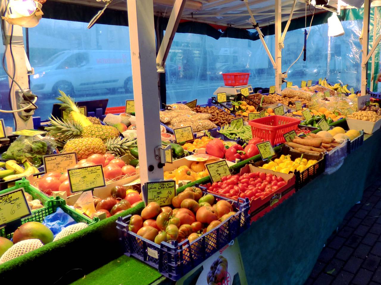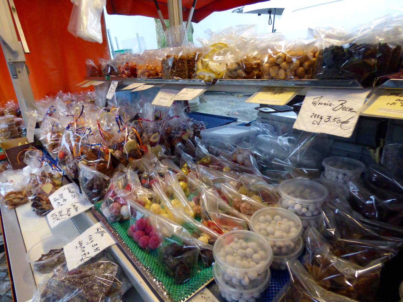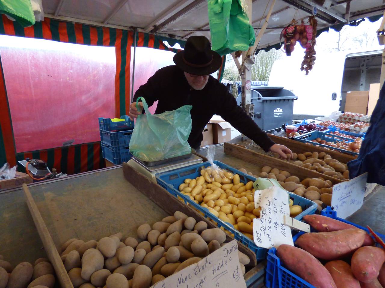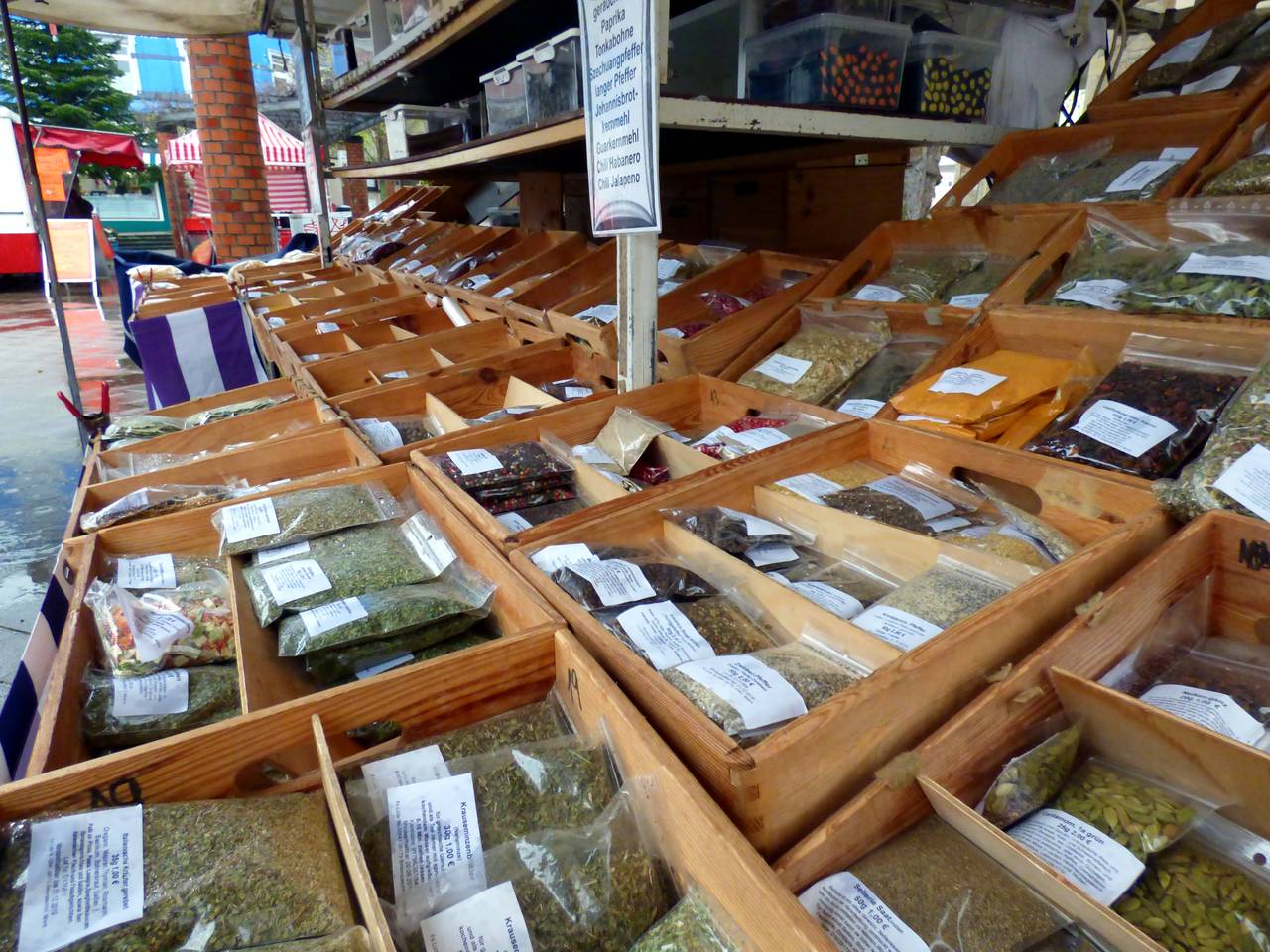Hier gibt es unter anderem Obst und Gemüse, Textilien. Wenn Ih an Walters Stand vorbeilauft, riecht Ihr sofort, was er anbietet: Tee, Kräuter und Gewürze duften schon vom Weiten. Viele Kunden kommen auch gern nach der Arbeit auf dem Weg nach Hause vorbei.