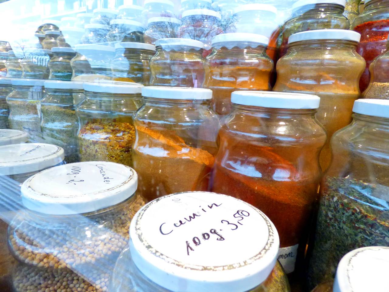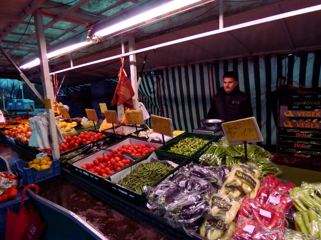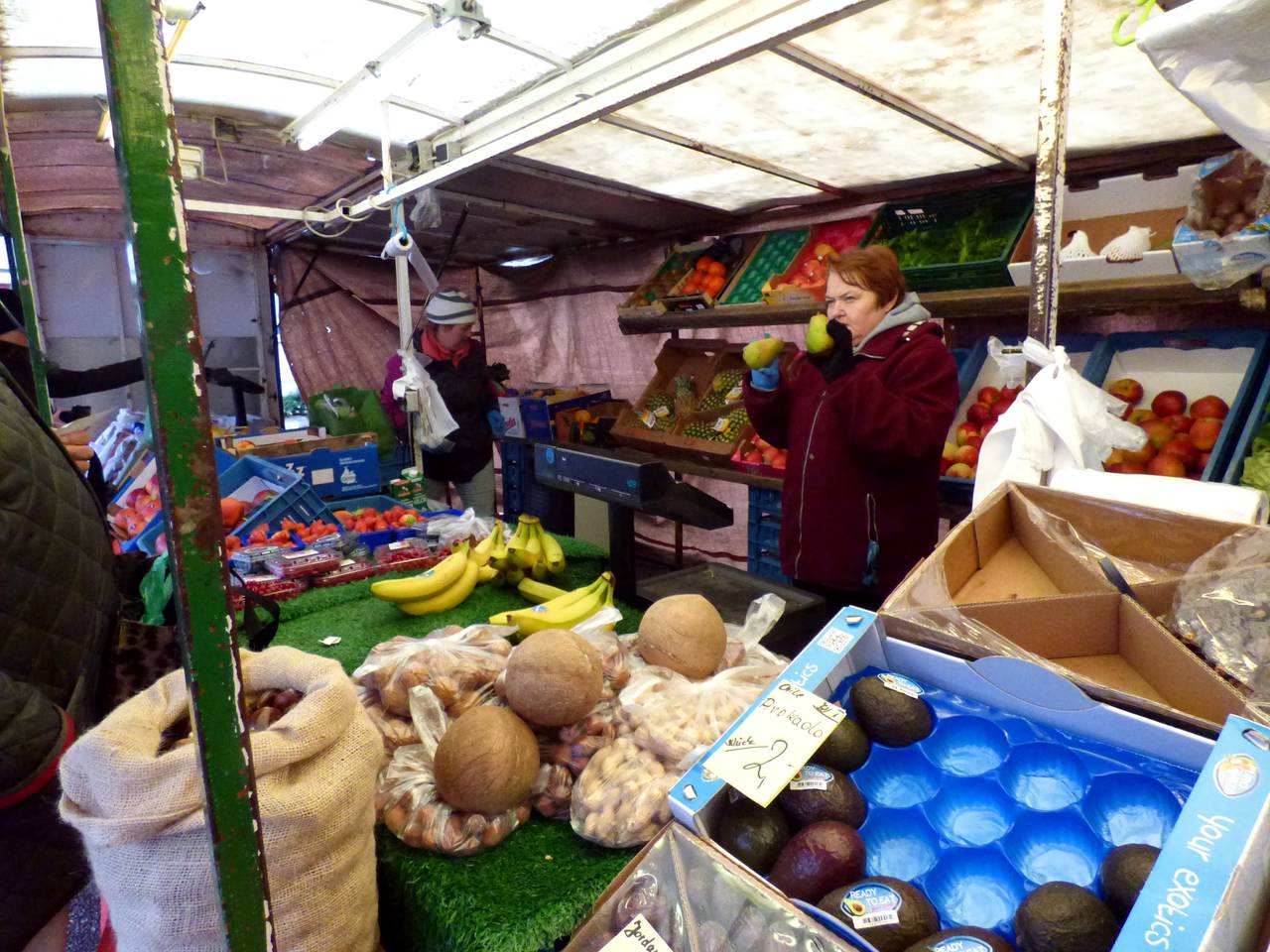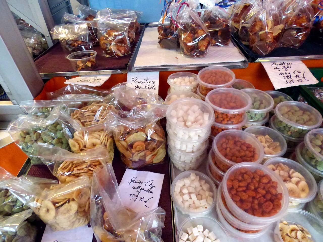 Hier gibt es unter anderem Obst und Gemüse, Textilien. Wenn Ih an Walters Stand vorbeilauft, riecht Ihr sofort, was er anbietet: Tee, Kräuter und Gewürze duften schon vom Weiten. Viele Kunden kommen auch gern nach der Arbeit auf dem Weg nach Hause vorbei.