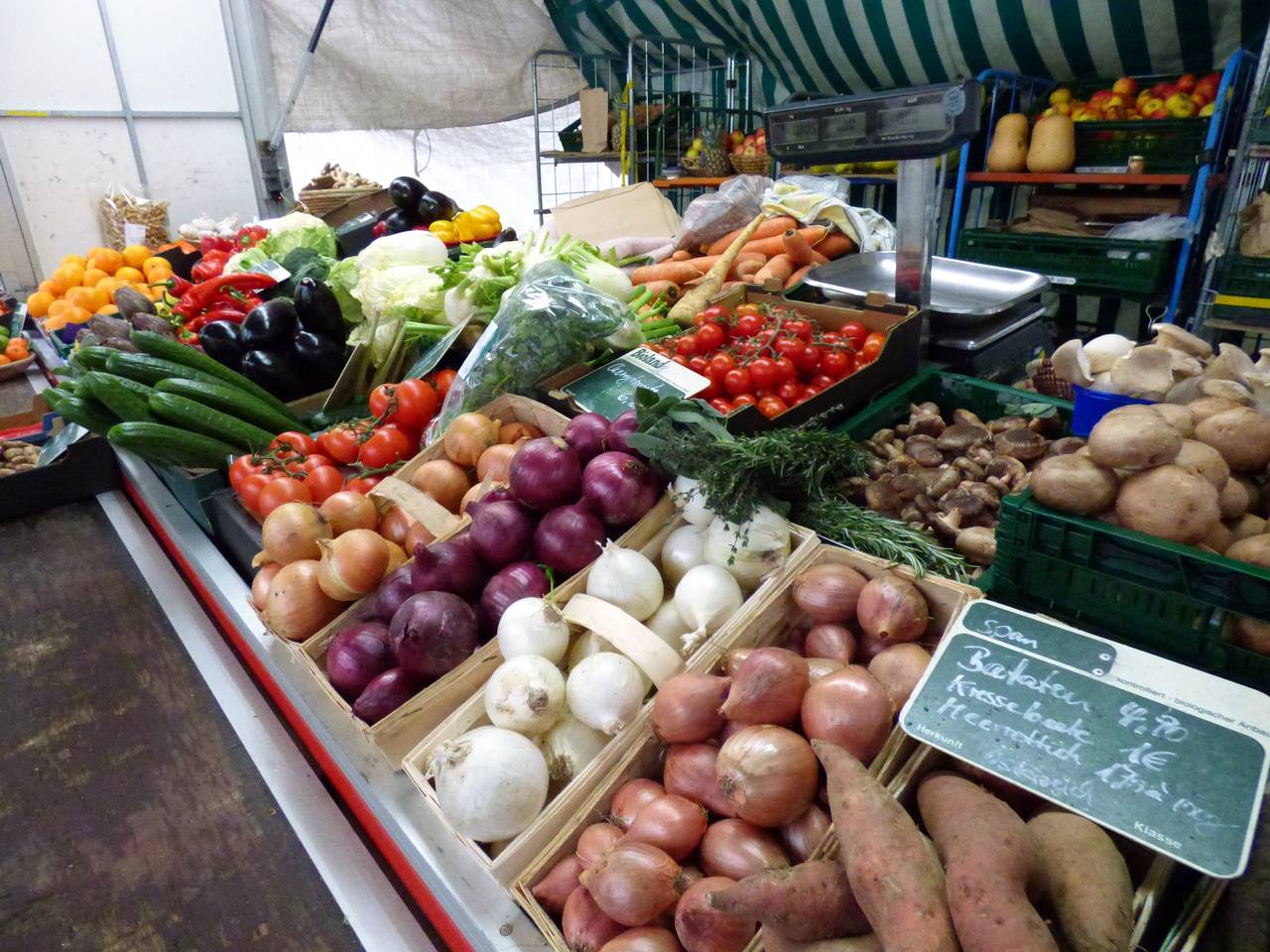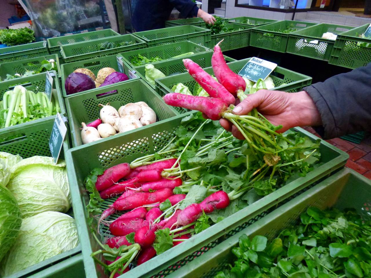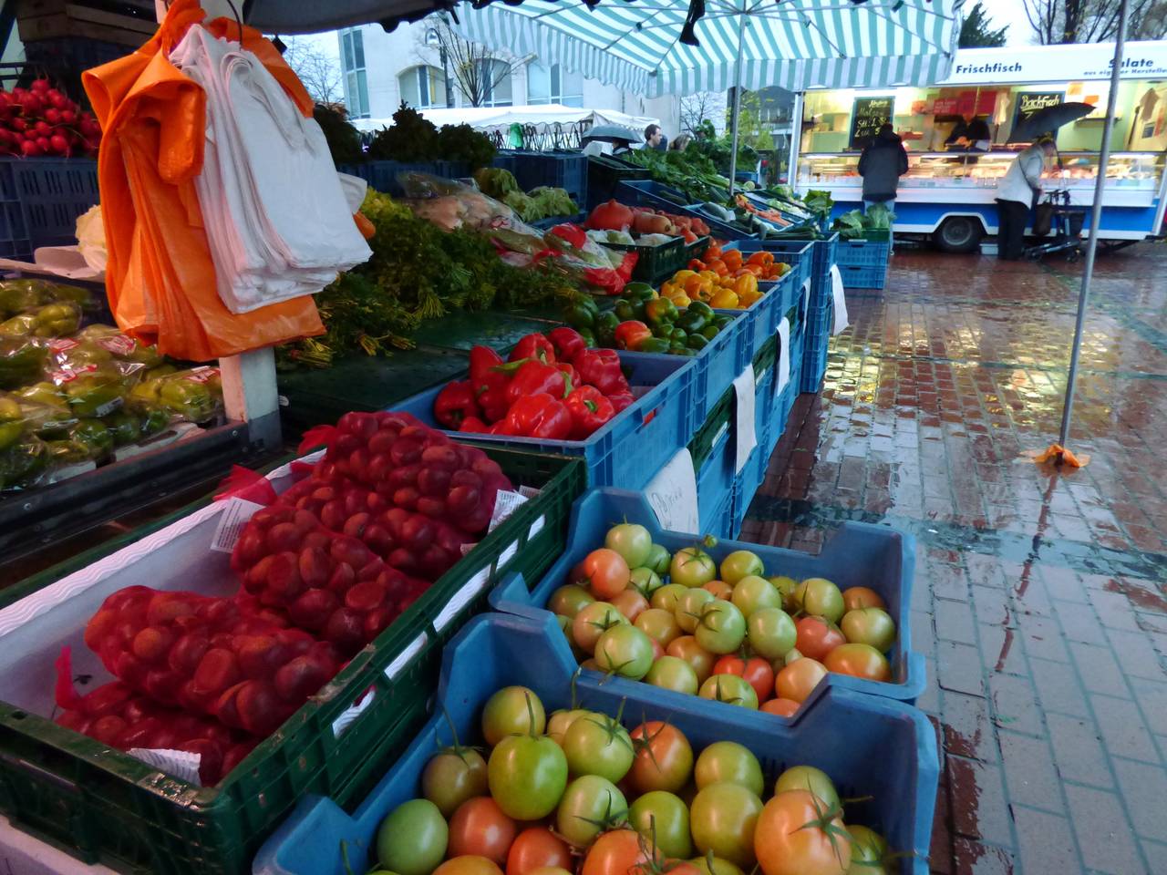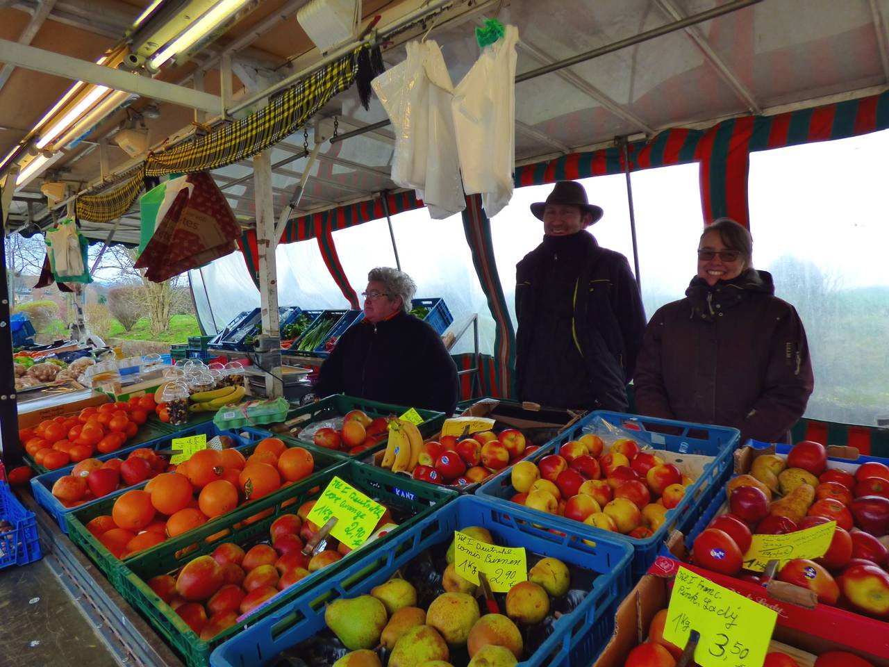 Hier gibt es Obst und Gemüse, einen Flammkuchenstand, einen Bäcker und einen holländischen Fischstand mit Backfisch.