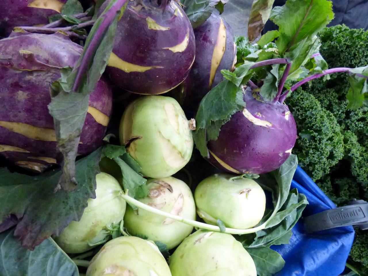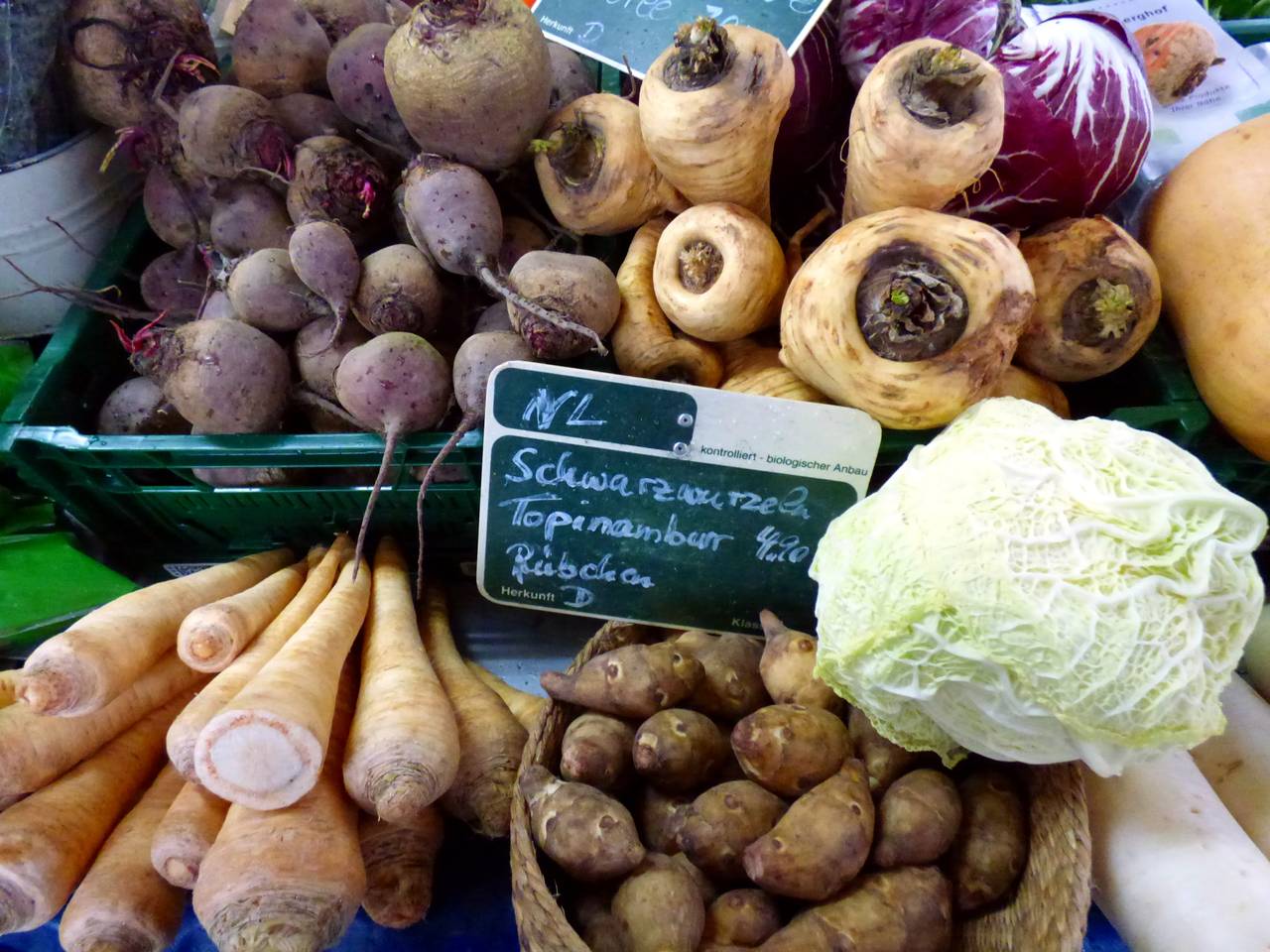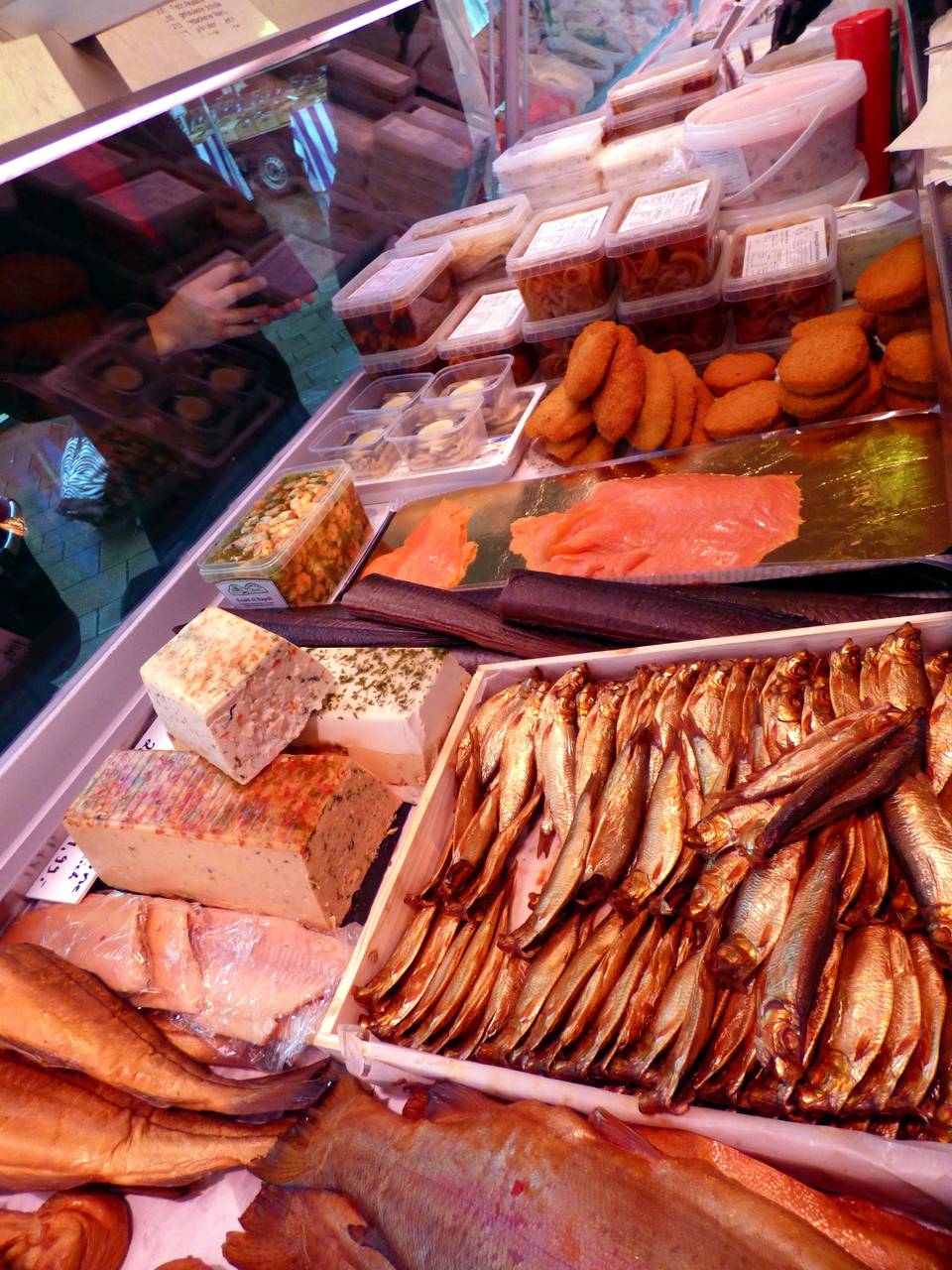 Hier gibt es Obst und Gemüse, einen Flammkuchenstand, einen Bäcker und einen holländischen Fischstand mit Backfisch.