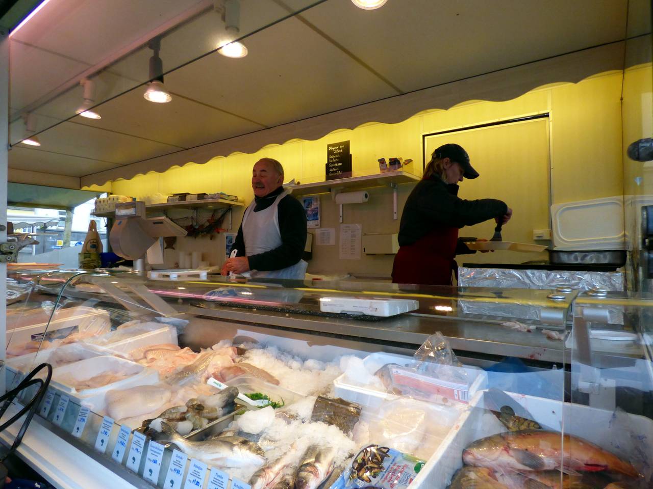 Hier gibt es Obst, Gemüse, Kartoffeln und Frischfisch. Mittwochs ist hier nur noch wenig los, das hat uns Fischhändler Alfred erzählt. Eigentlich ist er schon in wohlverdienter Rente, aber er hilft seiner Tochter am Stand.