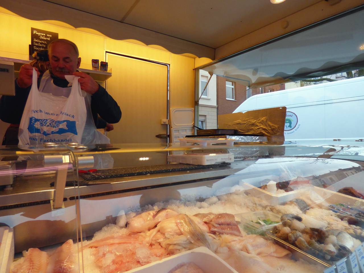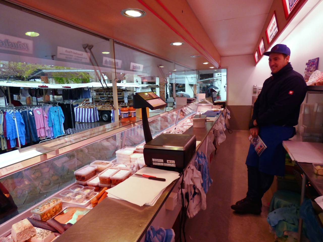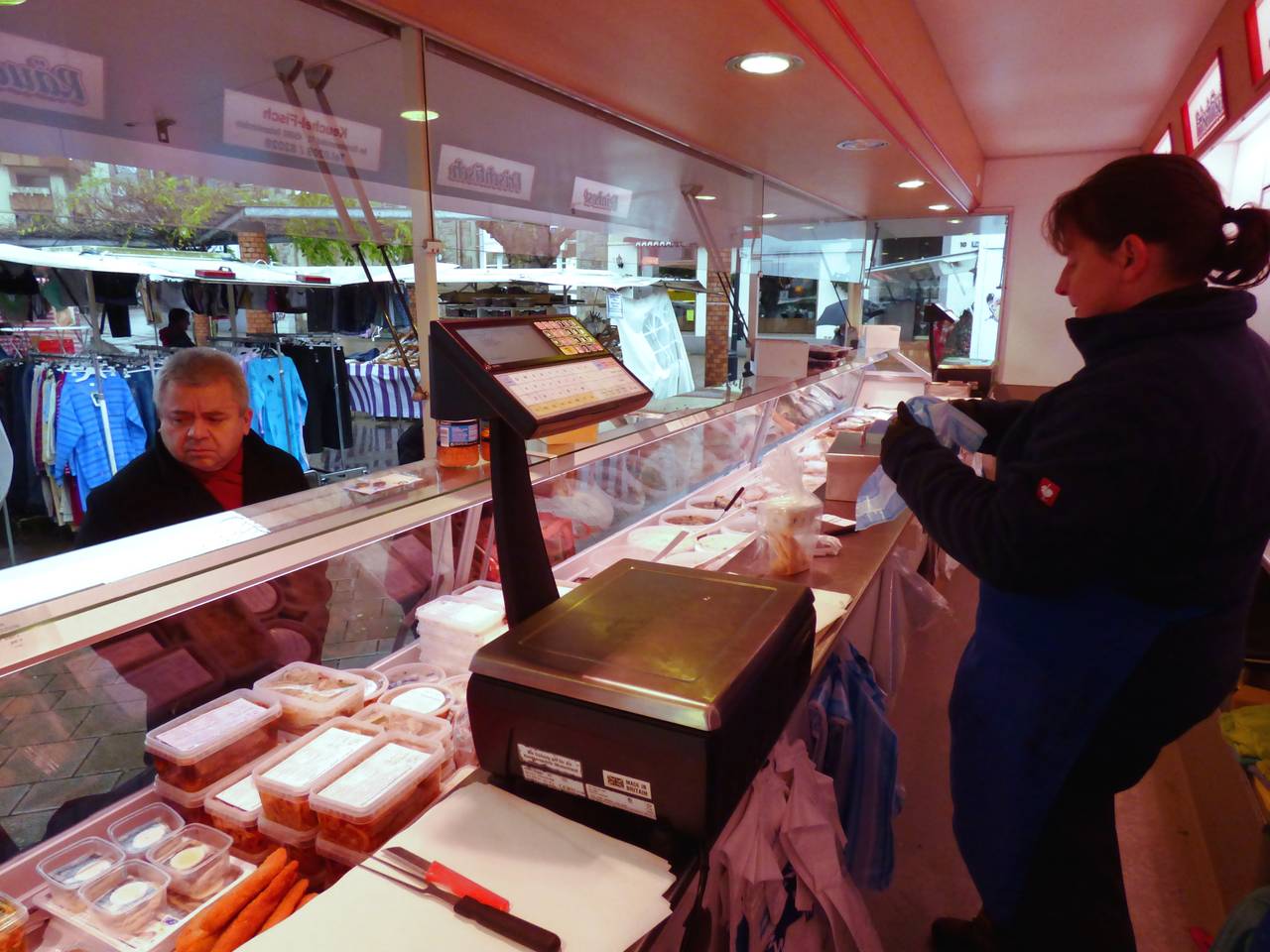 Hier gibt es Frischfleisch, Obst, Gemüse, Blumen, Textilien. Am Fischstand steht Marvin Keuchel. Er ist ein gutes Gegenbeispiel zu den sonstigen Nachwuchsproblemen der Markthändler. Von seinem Stand aus hat man einen guten Überblick über den Markt. Er hatte sein Studium abgebrochen, um einen Teil des Geschäfts zu übernehmen. Für ihn ist die Tradition besonders beeindruckend. Damals kamen die Händler noch mit Pferdekarren zum Markt nach Kupferdreh.