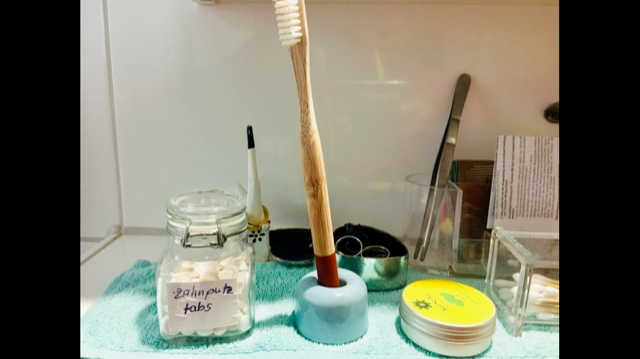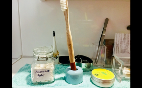 - Zähne mit Zahnputztabs, statt Zahnpasta putzen, Zahnbürsten aus wiederverwertbaren Materialien kaufen