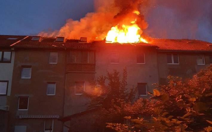 Später am Abend wurde die Feuerwehr dann zu einem weiteren Brand in der Gelsenkirchener Straße in Katernberg gerufen. Dort brannte das Dach eines Wohnhauses. Schon auf der Hinfahrt konnten die Feuerwehrleute die Flammen erkennen. Auch aus den anliegenden Häusern kam Rauch. Weil der Dachstuhl des brennenden Hauses mit den nebenstehenden Häusern verbunden war, versuchte die Feuerwehr zunächst, die anliegenden Häuser abzutrennen. Danach musste sie den Brand von außen löschen, weil die Treppe zum Dachgeschoss bereits völlig abgebrannt war. Nach der Löschung stand fest: Das Haus, in dem sich der Brand entwickelte und zwei angrenzende Häuser bleiben erstmal unbewohnbar. Eine Statikerin hatte festgestellt, dass sie durch den Brand zu unsicher geworden sind.